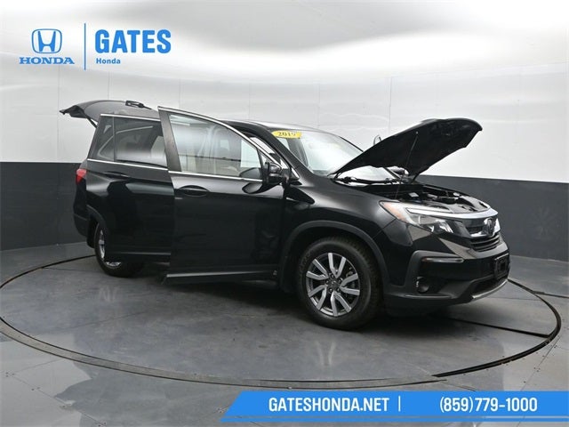 Pilot EX-L, 4D Sport Utility, 3.5L V6 24V SOHC i-VTEC, 6-Speed Automatic, FWD, Black, Black Leather, 18 Machine-Finished Alloy Wheels, 3rd row seats: split-bench, 4-Wheel Disc Brakes, 4.25 Axle Ratio, 7 Speakers, A/V remote: CabinControl, ABS brakes, Air Conditioning, Alloy wheels, AM/FM radio: SiriusXM, Apple CarPlay/Android Auto, Auto High-beam Headlights, Auto-dimming Rear-View mirror, Automatic temperature control, Blind Spot Information (BSI) System warning, Brake assist, Bumpers: body-color, Delay-off headlights, Driver door bin, Driver vanity mirror, Dual front impact airbags, Dual front side impact airbags, Electronic Stability Control, Emergency communication system: HondaLink Assist, Exterior Parking Camera Rear, Forward collision: Collision Mitigation Braking System (CMBS) + FCW mitigation, Four wheel independent suspension, Front anti-roll bar, Front Bucket Seats, Front Center Armrest, Front dual zone A/C, Front fog lights, Front reading lights, Fully automatic headlights, Garage door transmitter: HomeLink, Heated door mirrors, Heated Front Bucket Seats, Heated front seats, Illuminated entry, Lane departure: Lane Keeping Assist System (LKAS) active, Leather Shift Knob, Leather-Trimmed Seats, Low tire pressure warning, Memory seat, Occupant sensing airbag, Outside temperature display, Overhead airbag, Overhead console, Panic alarm, Passenger door bin, Passenger vanity mirror, Power door mirrors, Power driver seat, Power Liftgate, Power moonroof, Power passenger seat, Power steering, Power windows, Radio data system, Radio: AM/FM Audio System, Rear air conditioning, Rear anti-roll bar, Rear reading lights, Rear seat center armrest, Rear window defroster, Rear window wiper, Reclining 3rd row seat, Remote keyless entry, Security system, Speed control, Speed-sensing steering, Speed-Sensitive Wipers, Split folding rear seat, Spoiler, Steering wheel mounted audio controls, Tachometer, Telescoping steering wheel, Tilt steering wheel, Traction control, Trip computer, Turn signal indicator mirrors, Variably intermittent wipers.