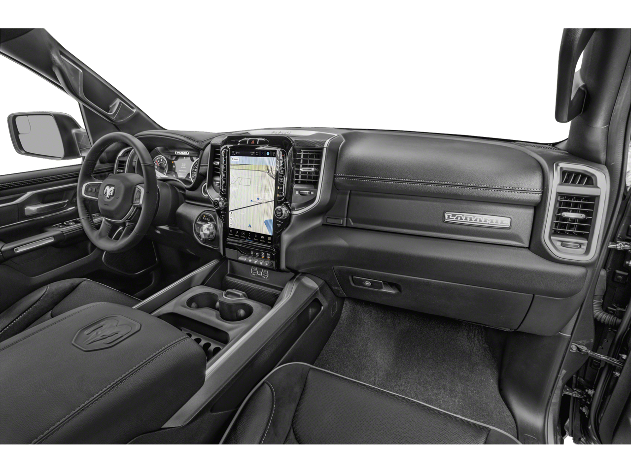 #1 Seat Foam Cushion, 10 Speakers, 12 Touchscreen Display, 2nd Row In Floor Storage Bins, 3 Rear Seat Head Restraints, 3.21 Rear Axle Ratio, 4 Way Front Headrests, 4-Wheel Disc Brakes, 48V Belt Starter Generator, 4G LTE Wi-Fi Hot Spot, ABS brakes, Adjustable pedals, Air Conditioning, Alloy wheels, AM/FM radio: SiriusXM with 360L, Apple CarPlay, Apple CarPlay/Android Auto, Audio memory, Auto High Beam Headlamp Control, Auto-dimming door mirrors, Auto-Dimming Exterior Driver Mirror, Auto-dimming Rear-View mirror, Automatic temperature control, Black Interior Accents, Blind Spot & Cross Path Detection, Body Color Exterior Mirrors, Body Color Front Bumper, Body Color Premium Power Mirrors, Body Color Rear Bumper w/Step Pads, Brake assist, Bumpers: chrome, Chrome Exterior Mirrors, Class IV Receiver Hitch, Compass, Connected Travel & Traffic Services, Connectivity - US/Canada, Convex Wide-Angle Exterior Mirror Insert, Delay-off headlights, Disassociated Touchscreen Display, Driver door bin, Driver Seat Memory, Driver vanity mirror, Dual front impact airbags, Dual front side impact airbags, Electric Shift-On-Demand Transfer Case, Electronic Stability Control, Exterior Mirrors Courtesy Lamps, Exterior Mirrors w/Heating Element, Exterior Mirrors w/Memory, Exterior Mirrors w/Supplemental Signals, Foam Bottle Insert (Door Trim Panel), For Details, Visit DriveUconnect.com, For More Info, Call 800-643-2112, Front anti-roll bar, Front Center Armrest w/Storage, Front Door Accent Lighting, Front dual zone A/C, Front fog lights, Front LED Fog Lamps, Front reading lights, Front Seat Back Map Pockets, Front wheel independent suspension, Fully automatic headlights, Garage door transmitter, Global Telematics Box Module (TBM), Google Android Auto, GPS Antenna Input, GPS Navigation, Grille Surround 3 Body Color Tex 2 Black, harman/kardon 19 Speaker Premium Sound, HD Radio, Heated door mirrors, Heated Front Seats, Heated front seats, Heated Steering Wheel, Heated steering wheel, Illuminated entry, Integrated Center Stack Radio, Integrated Voice Command w/Bluetooth®, Laramie Level B Equipment Group, Leather steering wheel, Leather Trim 40/20/40 Bench Seat, LED Reflector Headlamps, Low tire pressure warning, Memory seat, Navigation System, Occupant sensing airbag, Outside temperature display, Overhead airbag, Overhead console, Panic alarm, ParkSense Front/Rear Park Assist w/Stop (DISC), ParkView Rear Back-Up Camera, Passenger door bin, Passenger vanity mirror, Pedal memory, Power 2-Way Driver Lumbar Adjust, Power 2-Way Passenger Lumbar Adjust, Power 8-Way Driver & Passenger Seats, Power door mirrors, Power driver seat, Power passenger seat, Power steering, Power windows, Power-Folding Mirrors, Quick Order Package 27H Laramie, Radio data system, Radio: Uconnect 5 Nav w/12.0 Display, Radio: Uconnect 5 Nav w/8.4 Display, Rain Sensitive Windshield Wipers, RAM Grille Badge - Chrome, Rear 60/40 Folding Seat, Rear anti-roll bar, Rear Door Accent Lighting, Rear Power Sliding Window, Rear seat center armrest, Rear step bumper, Rear Underseat Compartment Storage, Rear Window Defroster, Remote keyless entry, Remote Tailgate Release, Security system, SiriusXM Radio Service, SiriusXM w/360L, Speed control, Split folding rear seat, Sport Appearance Package, Sport Decal, Sport Performance Hood, Steering wheel mounted audio controls, Tachometer, Telescoping steering wheel, Tilt steering wheel, Traction control, Trailer Brake Control, Trip computer, Turn signal indicator mirrors, USB Host Flip, Variably intermittent wipers, Ventilated Front Seats, Ventilated front seats, Voltmeter, Wheels: 18 x 8 Aluminum Base Painted, Wheels: 20 x 9 Premium Painted w/Inserts, Wheels: 22 x 9 Forged Aluminum.