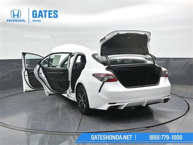 Camry SE, 4D Sedan, 2.5L I4 DOHC 16V, 8-Speed Automatic, FWD, White, Ash Artificial Leather, 4-Wheel Disc Brakes, 6 Speakers, ABS brakes, Air Conditioning, AM/FM radio: SiriusXM, Apple CarPlay/Android Auto, Auto High-beam Headlights, Automatic temperature control, Brake assist, Bumpers: body-color, Delay-off headlights, Driver door bin, Driver vanity mirror, Dual front impact airbags, Dual front side impact airbags, Electronic Stability Control, Emergency communication system: Safety Connect (1-year trial), Exterior Parking Camera Rear, Four wheel independent suspension, Front anti-roll bar, Front dual zone A/C, Front reading lights, Fully automatic headlights, Heated door mirrors, Illuminated entry, Knee airbag, Leather steering wheel, Low tire pressure warning, Occupant sensing airbag, Outside temperature display, Overhead airbag, Overhead console, Panic alarm, Passenger vanity mirror, Power door mirrors, Power driver seat, Power steering, Power windows, Radio data system, Radio: Audio, Rear anti-roll bar, Rear seat center armrest, Rear side impact airbag, Rear window defroster, Remote keyless entry, Security system, Speed control, Speed-sensing steering, Spoiler, Steering wheel mounted audio controls, Tachometer, Telescoping steering wheel, Tilt steering wheel, Traction control, Trip computer, Turn signal indicator mirrors.
